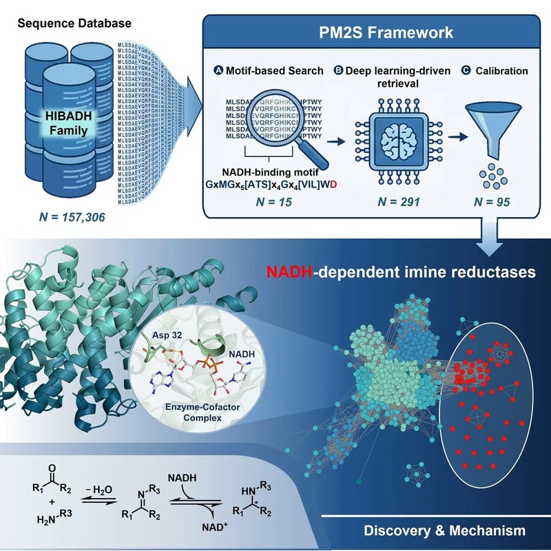 为突破这一局限,研究团队立足酶的辅酶结合保守基序,开发了PM2S (Protein Motif to Search)酶挖掘策略。该策略整合了基序搜索、深度学习驱动的迭代检索与结果校准三大模块,成功从15万条基因序列中筛选获得95个候选的天然NADH依赖型亚胺还原酶。实验结果表明,这些候选酶偏好以NADH为辅因子,催化亚胺还原及还原胺化反应,展现出极为宽泛的底物谱,并已用于西那卡塞等药物关键中间体的合成。